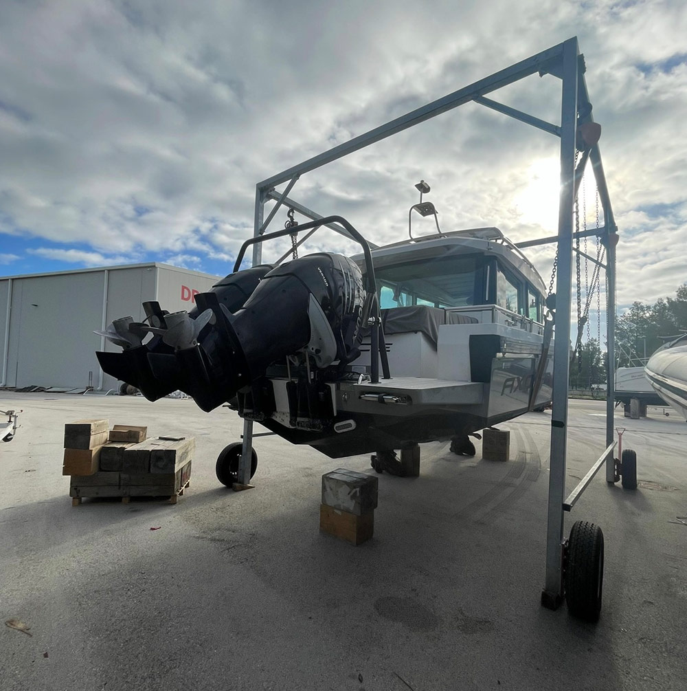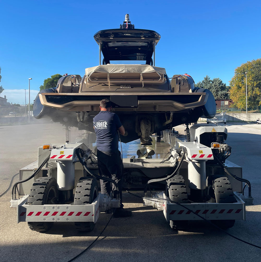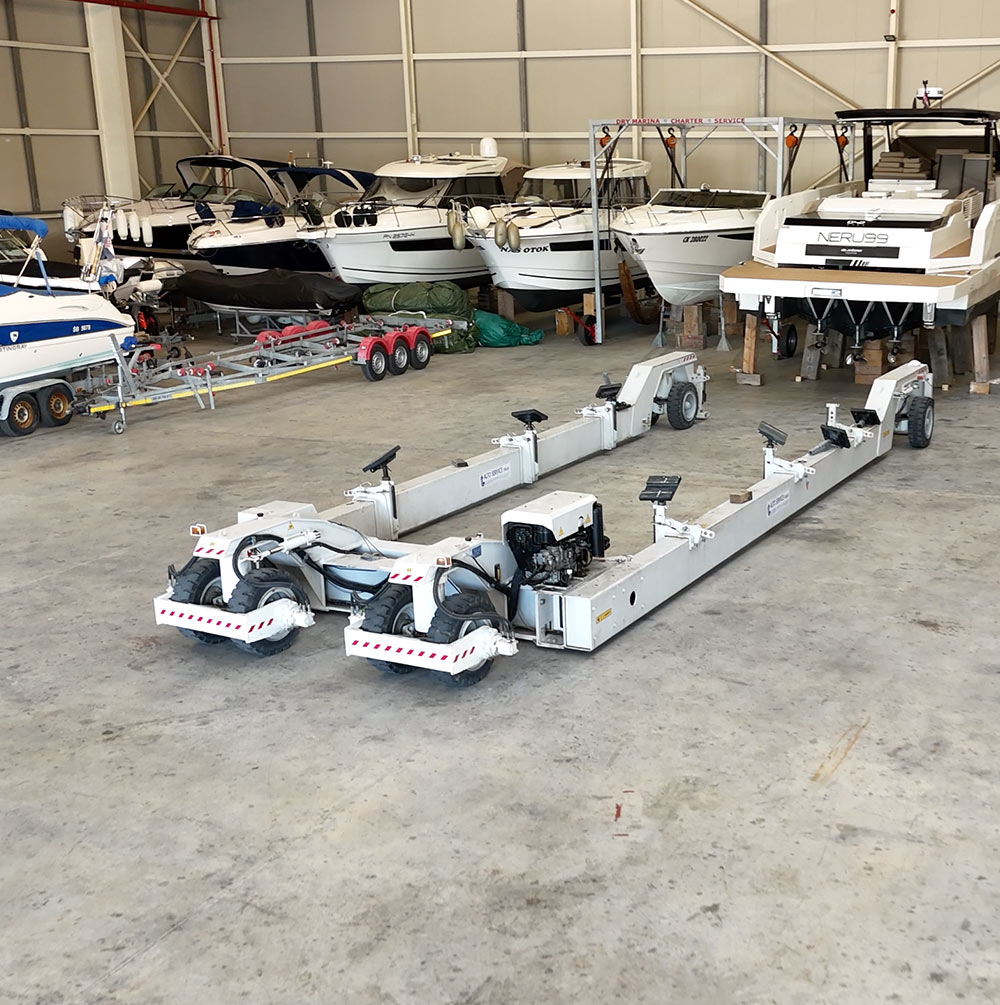 Our own truck and hydraulic crane with up to 40 tons of lifting capacity for safe and flexible handling of your yacht.